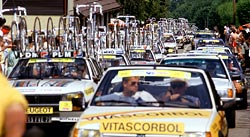 Ein riesiger Tross begleitet die Radler. Hier die Begleitwagen der Mannschaften mit Teamleitern, Mechanikern und Ersatzrädern. | ||